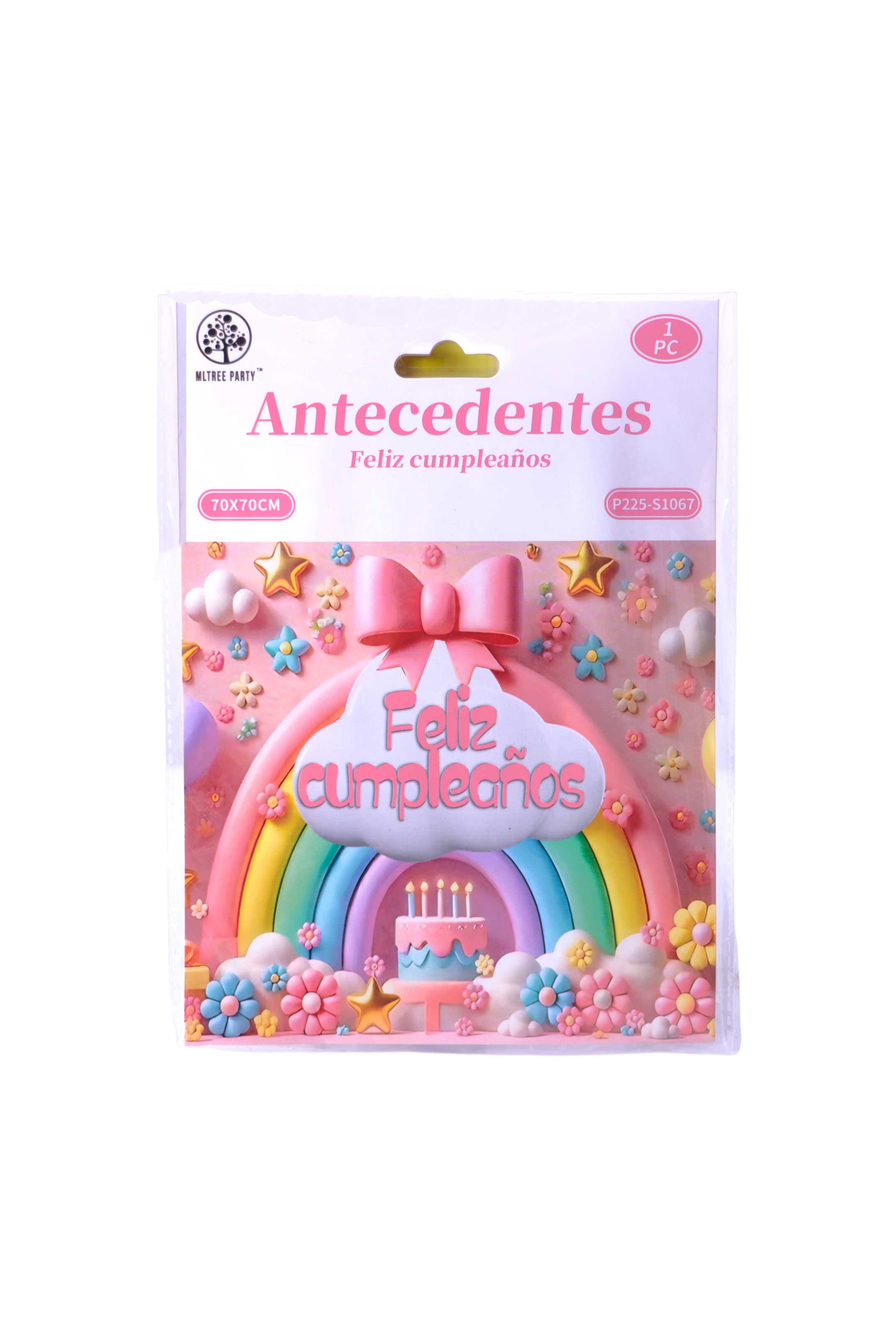 • Presenta un hermoso arcoíris, nubes, flores y detalles infantiles con el mensaje Feliz Cumpleaños