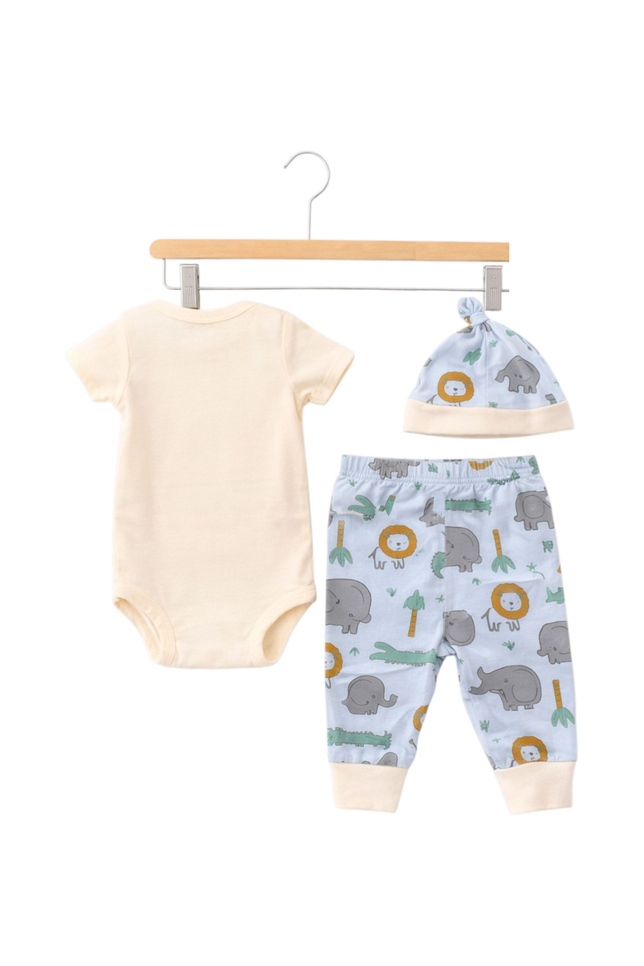 • Incluye un pantalón con elástico, body cuello redondo y un gorro