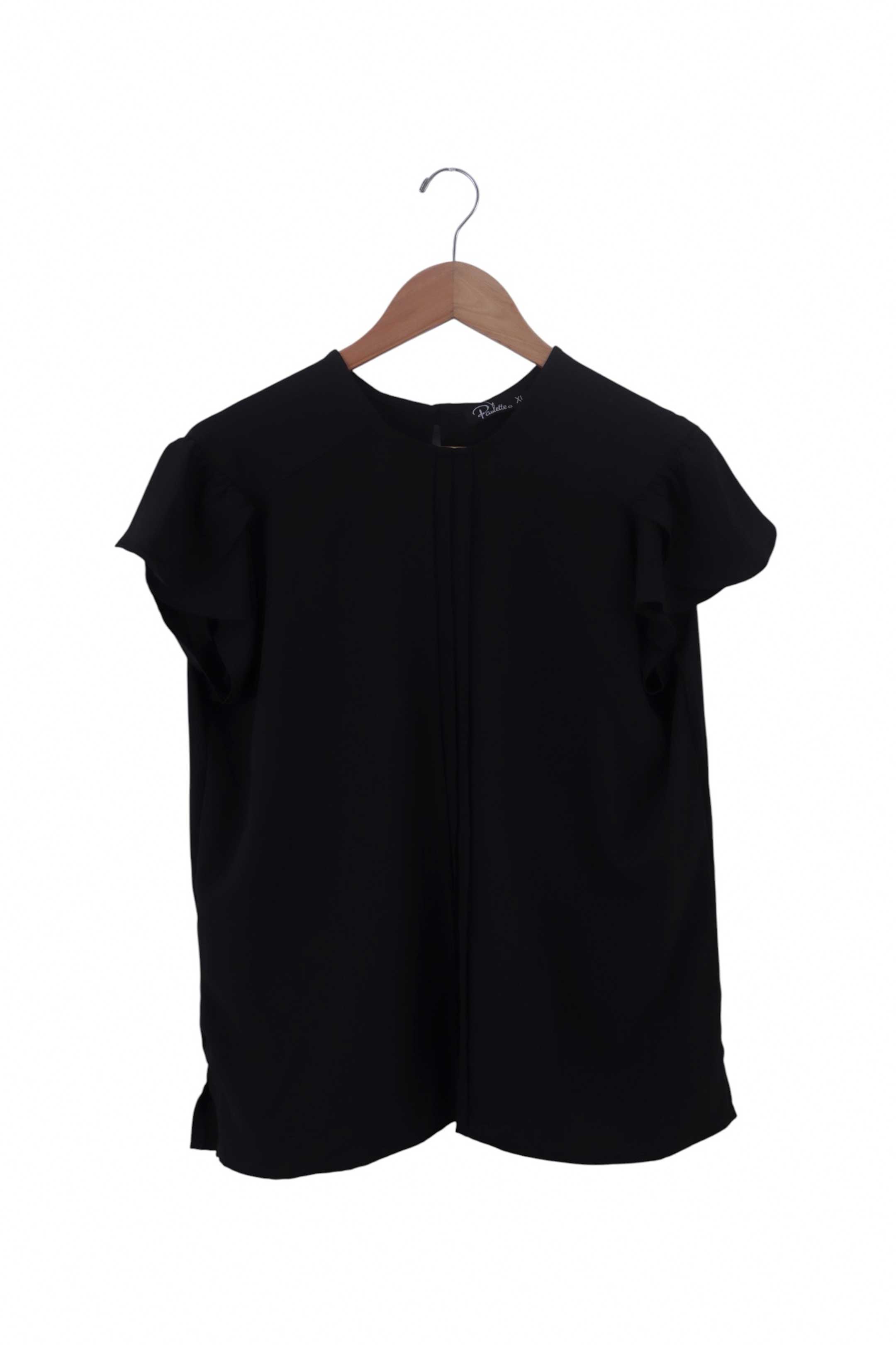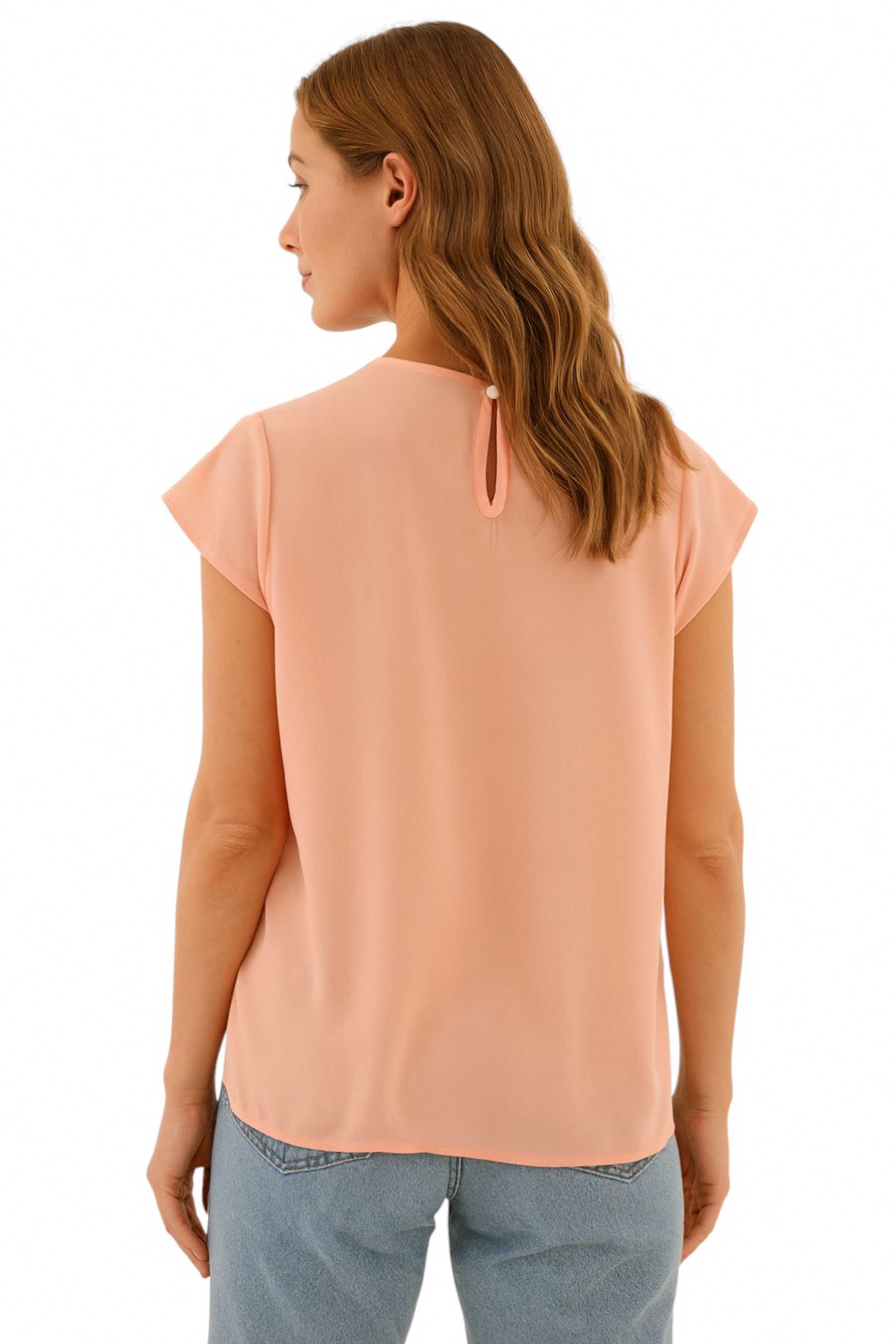 • Blusa femenina en tonos suaves con delicados pliegues frontales y mangas con volantes fluidos