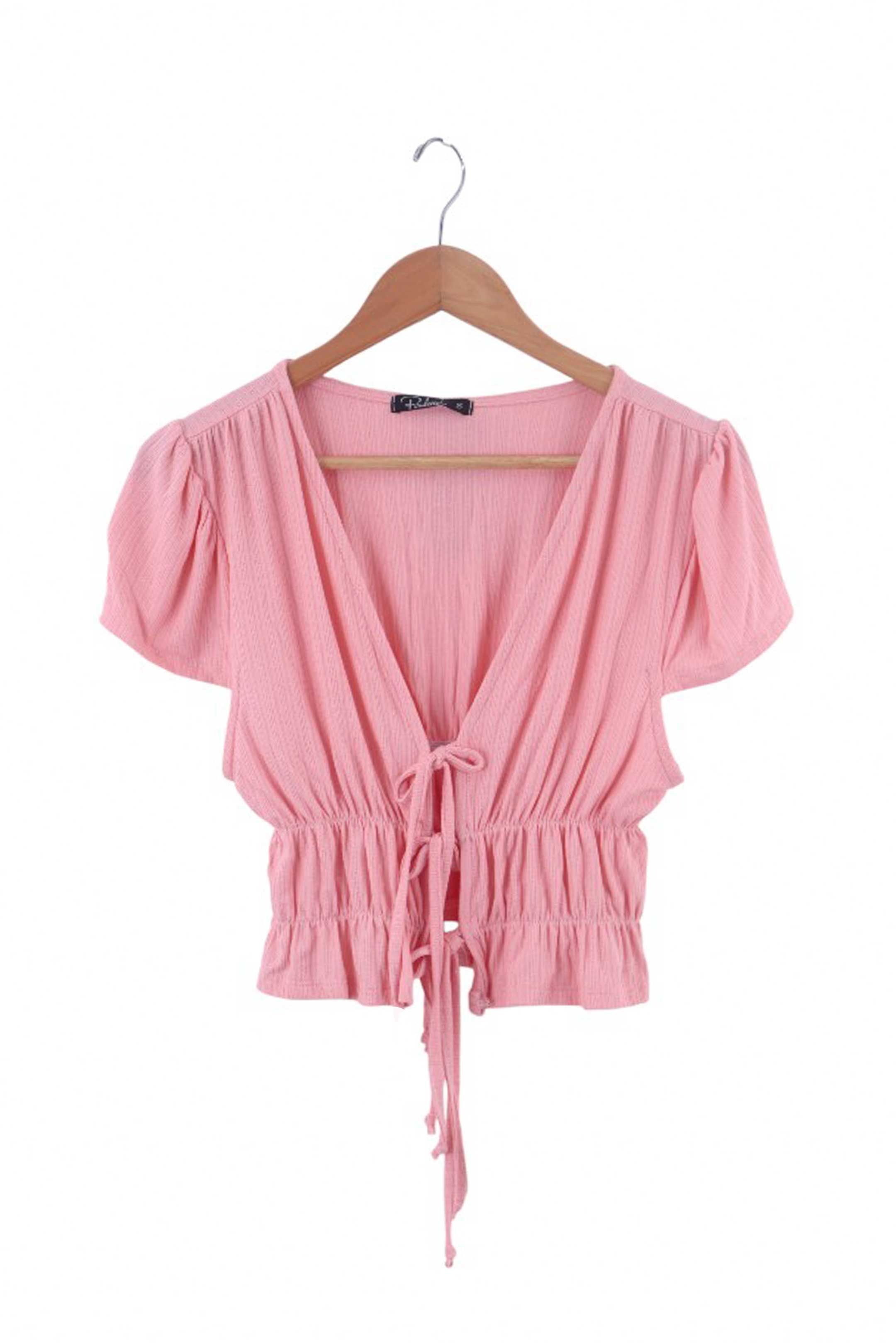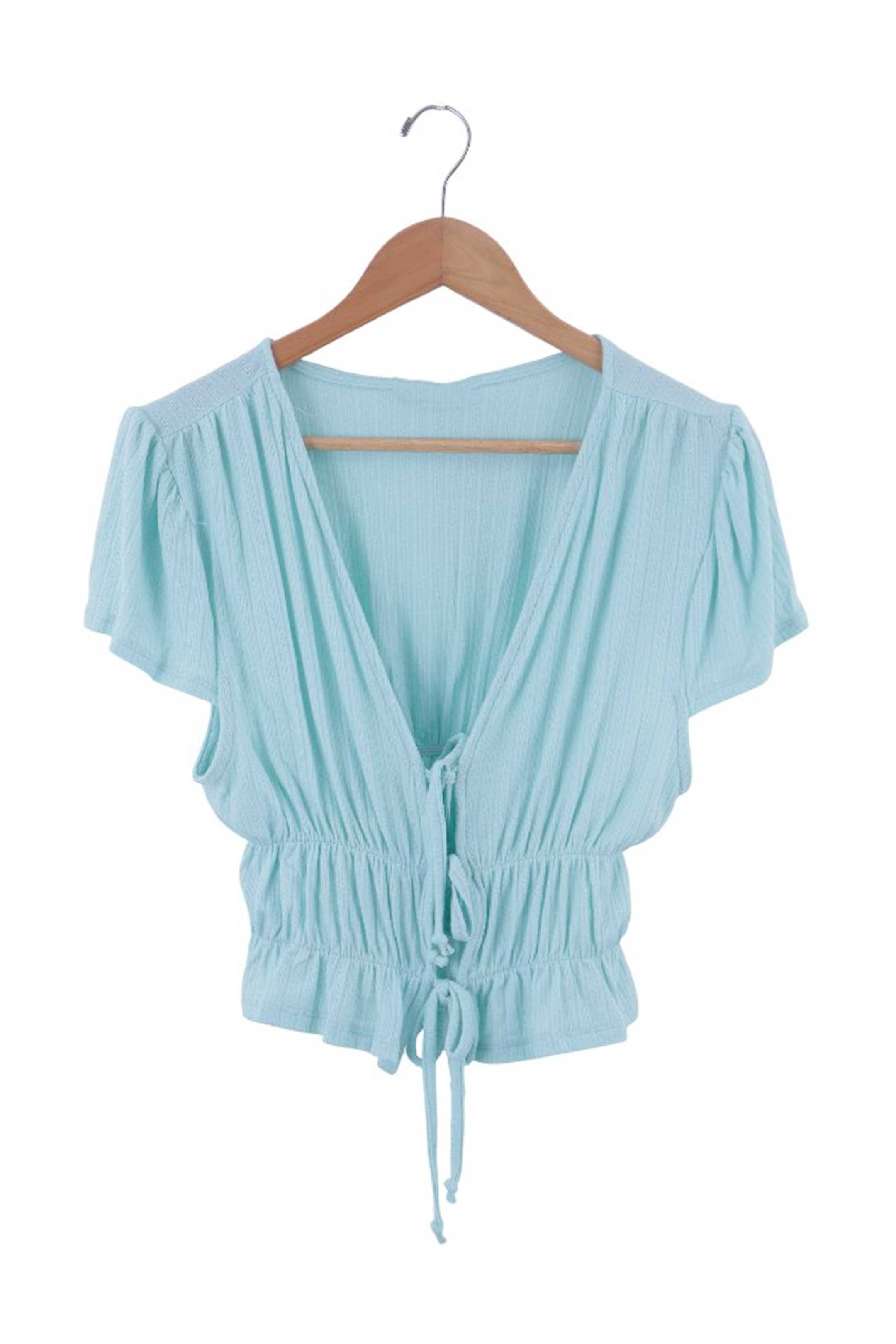 • Presenta un escote en V con delicado ajuste de lazo frontal