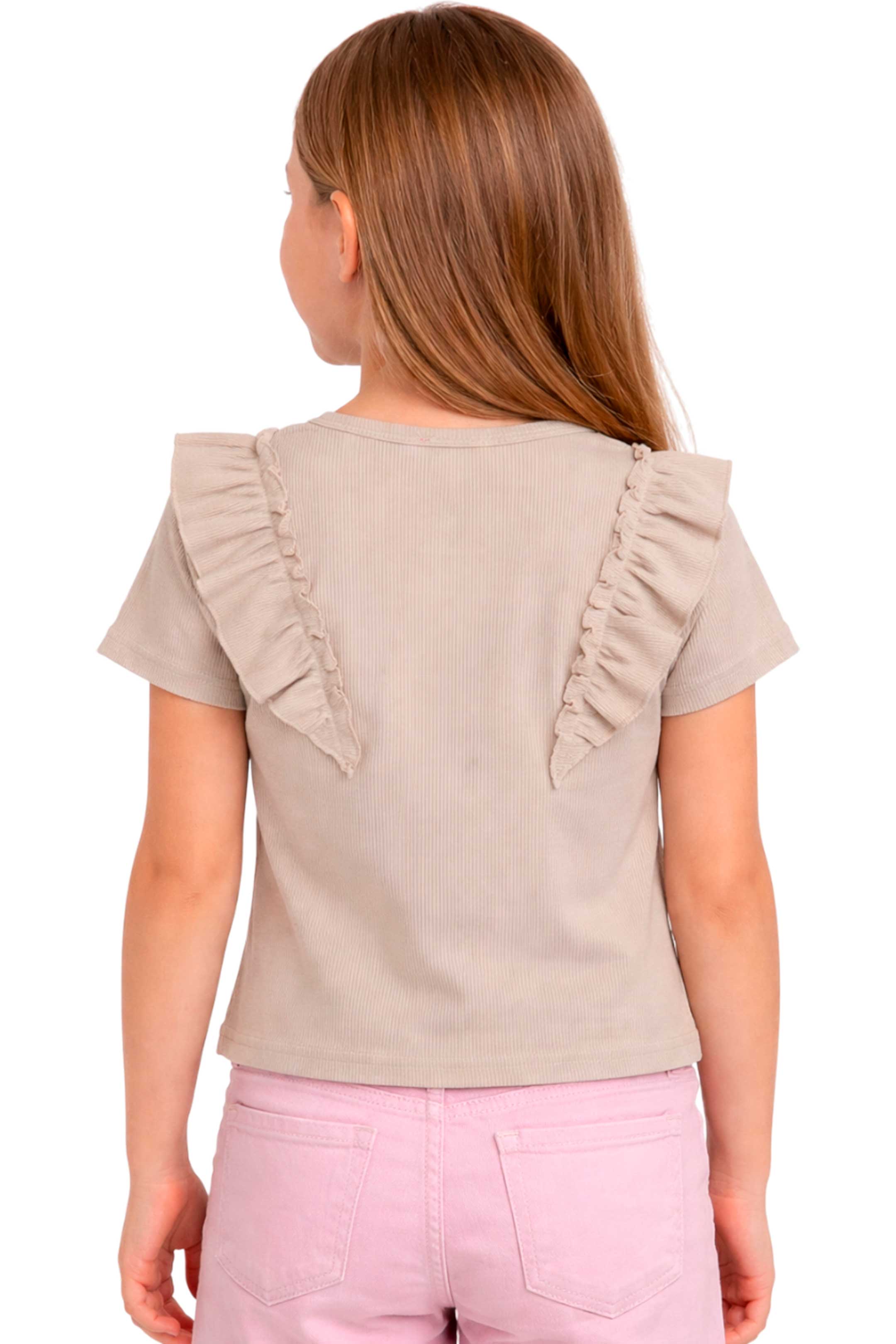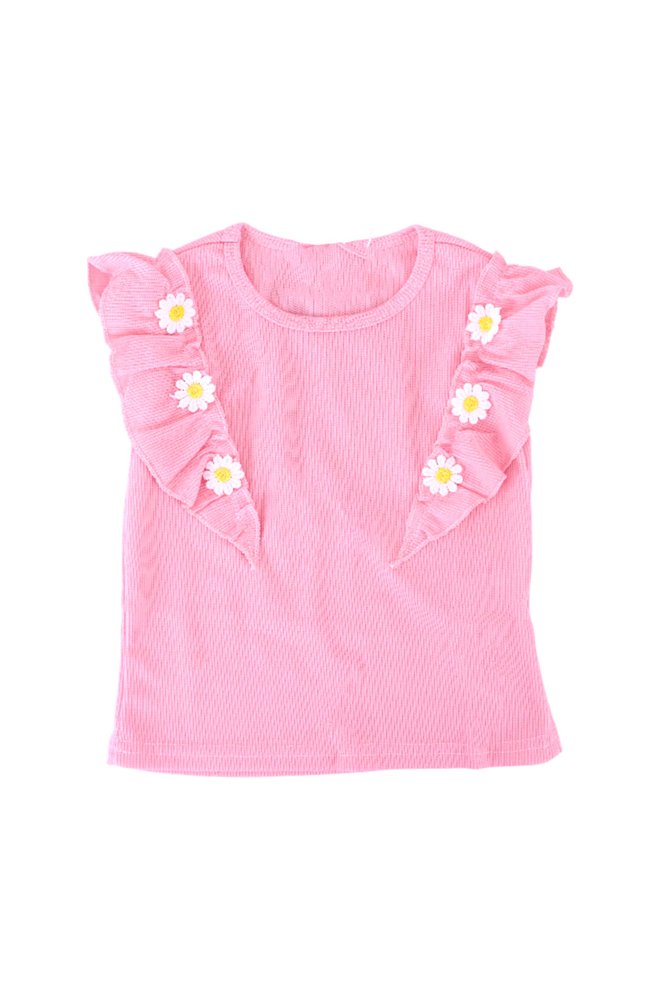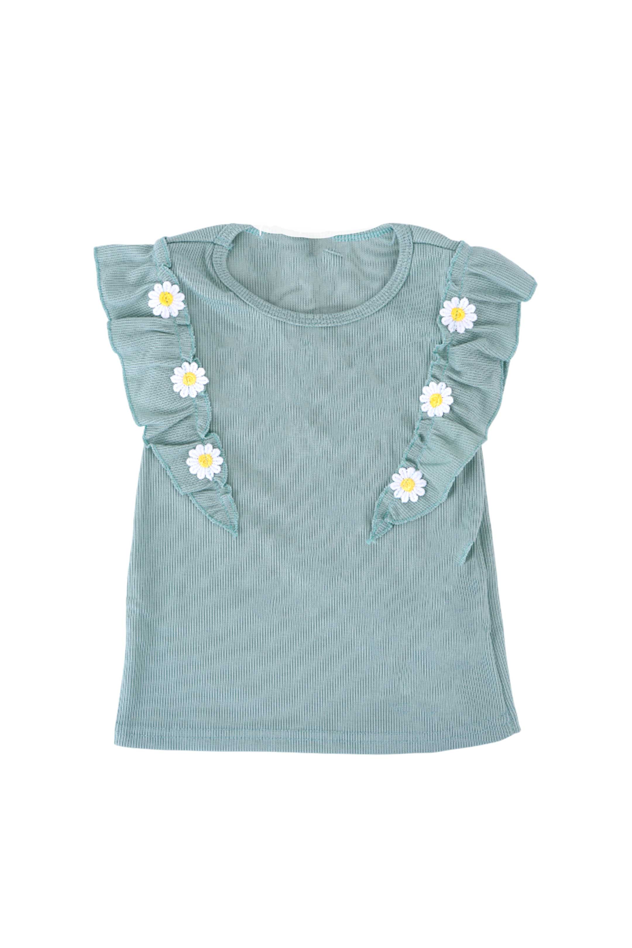 • Blusa que presenta un cuello redondo clásico, mangas cortas y delicados detalles de olanes al frente adornados con aplicaciones florales