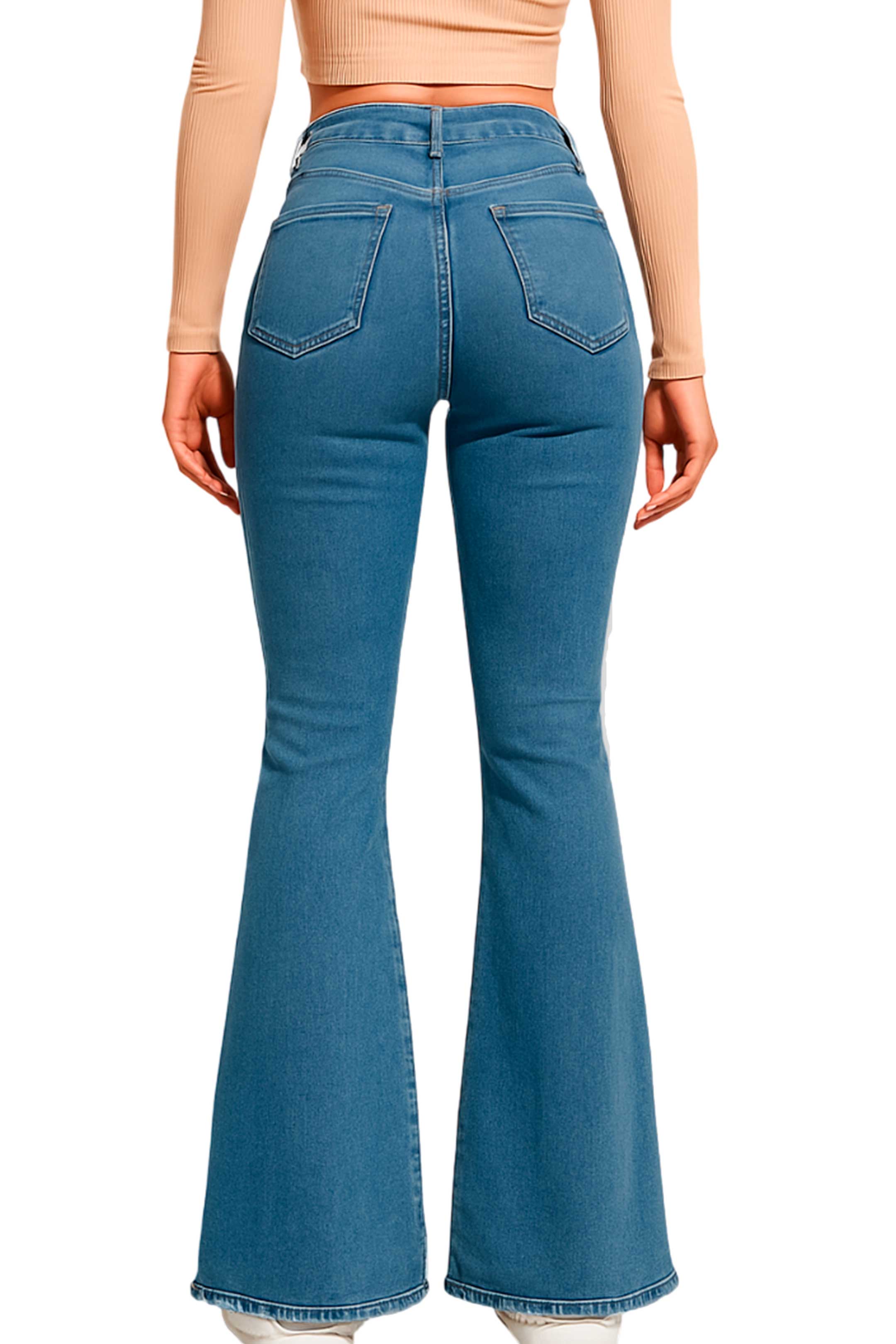 • Estilo acampanado de tiro alto de mezclilla con un cierre frontal con botón metálico