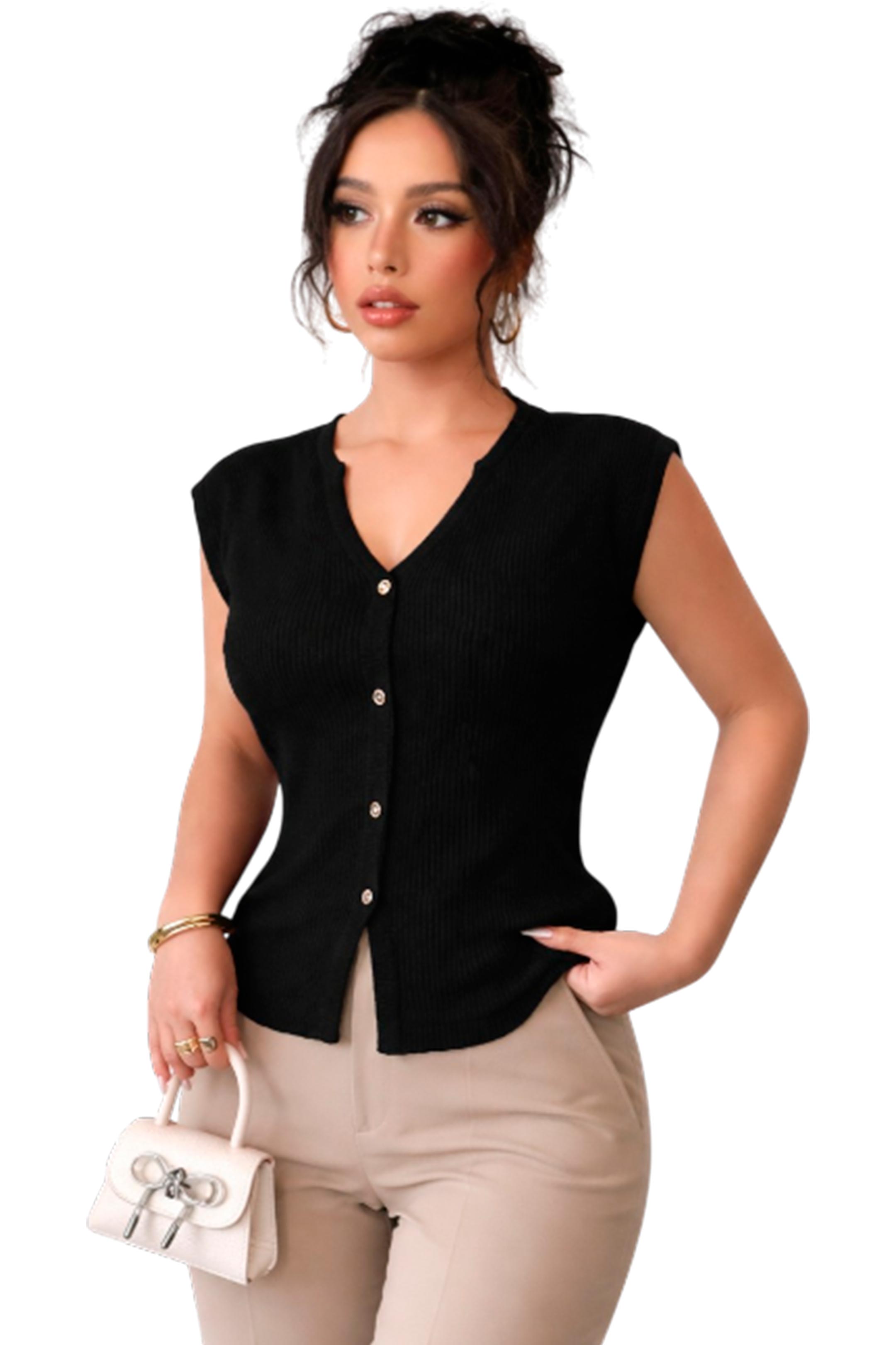 • Presenra escote en V con detalle de abertura frontal y botones decorativos
